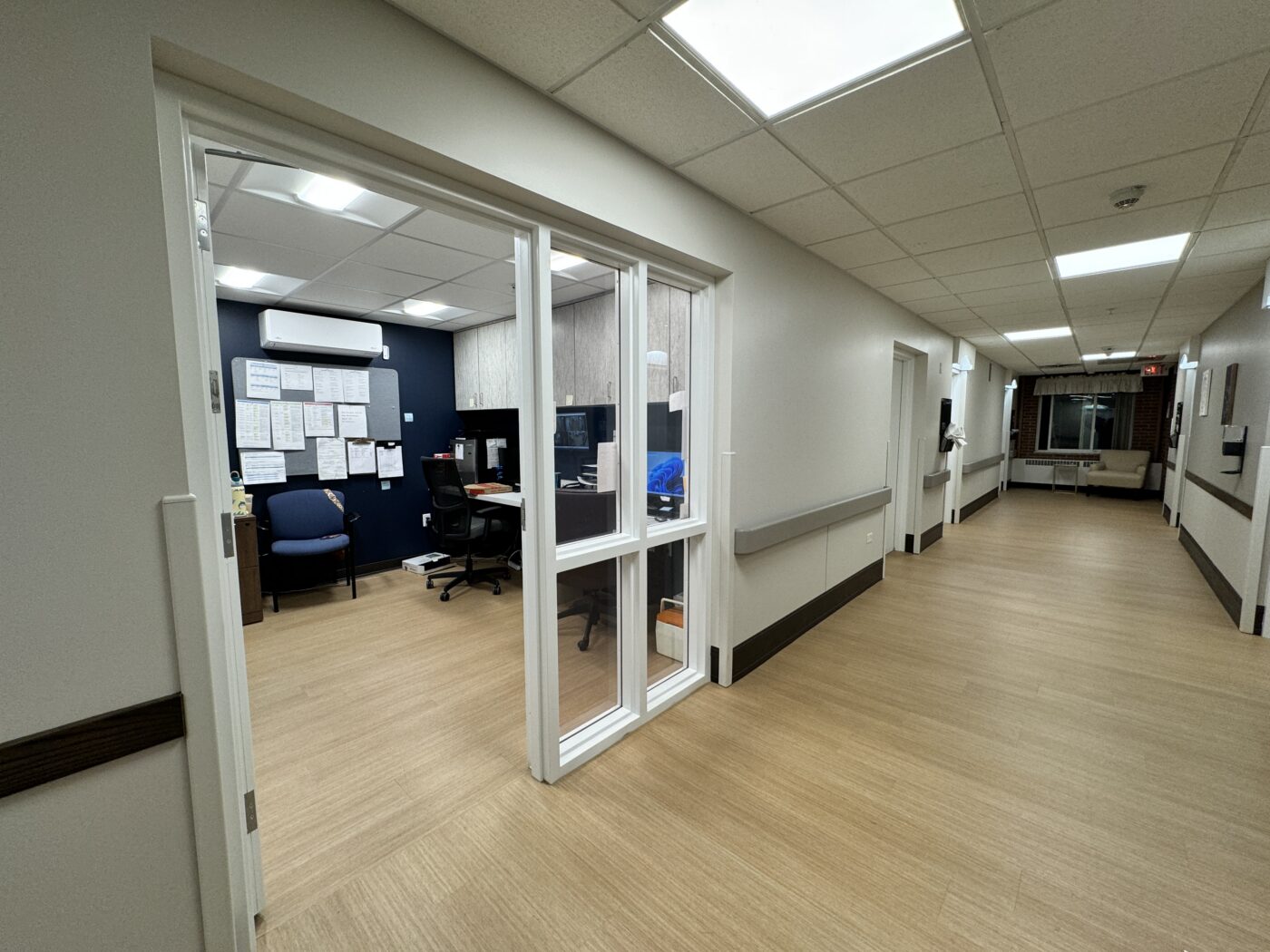 This renovation of an occupied memory care unit reworks the existing floor plan to add a new vestibule and lounge, while updating the shower and dining room layouts. Corridor finishes are being refreshed, and mechanical, electrical, plumbing, and fire protection upgrades are included, all carefully coordinated to minimize disruption to residents and staff.
